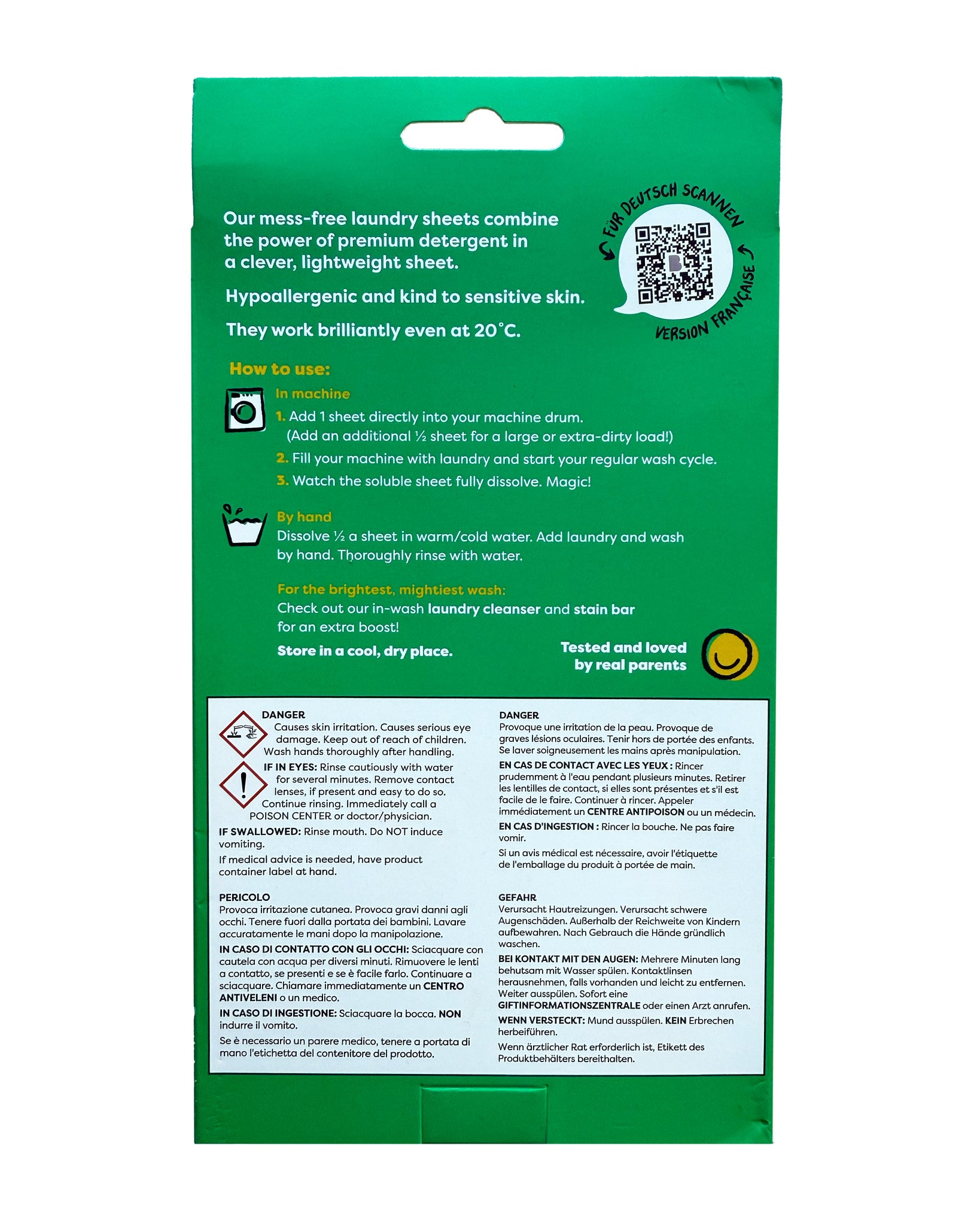 Vienas lapelis – vienam skalbimui. Efektyviai pašalina dėmes ir kvapus net esant 20 °C temperatūrai ar trumpuose skalbimo cikluose.
