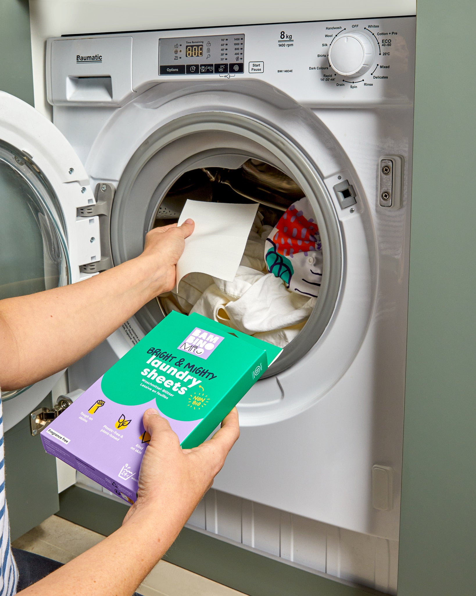 Tiesiog įdėkite 1 lapelį į skalbimo būgną – jis visiškai ištirps ir užtikrins nepriekaištingą švarą.